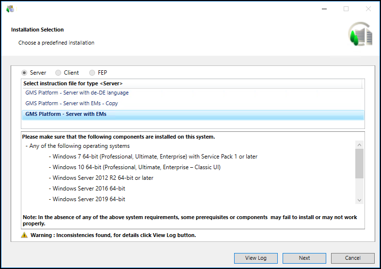 - In the Installation Selection dialog box, that displays, when there is a single GMS Platform.xml file for multiple setup types (Server, Client FEP), select the required setup type by changing the default (Server). Also verify the listed required software that is not included in the installation program. Ensure that the computer has all listed software installed before clicking Next; otherwise, a message displays.