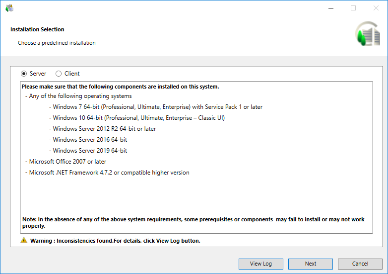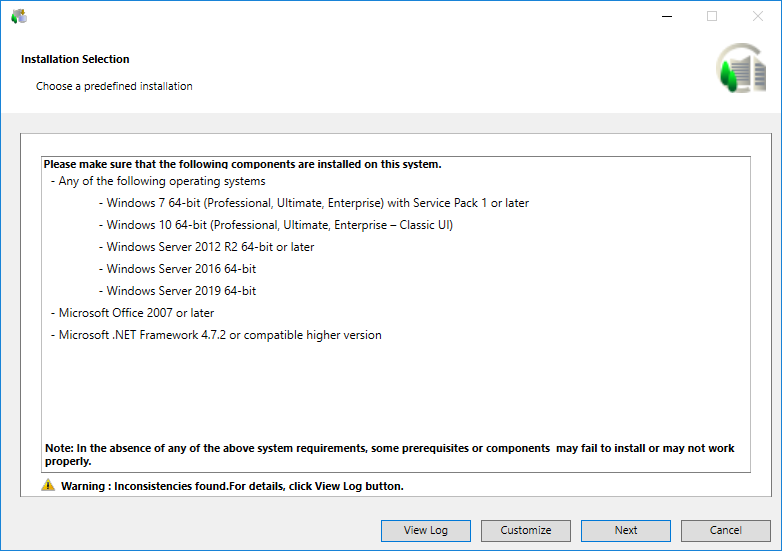 For any consistency issues regarding the platform (GMS folder) or EM folder, including the post-installations steps, a warning message displays in the Installation Selection dialog box and you can view details by clicking View Log. For more information see, Consistency Check Scenarios.