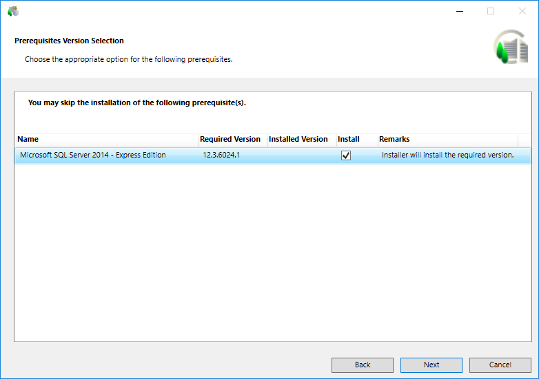 NOTE 2: If the compatible higher version of SQL is already installed on your computer, by default, the Installer skips (the Install check box is not selected) the installation of the lower version of SQL.