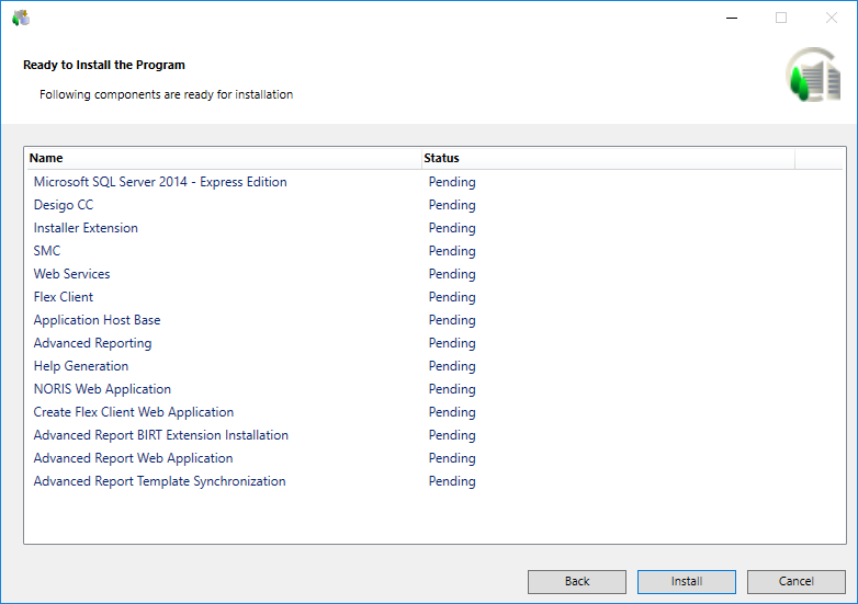- Click Next to display the Ready to Install the Program dialog box listing the status of the prerequisites, Desigo CC installation, extension modules installation, help merging status, and the status of the post-installation steps that you selected for execution and status for those which are executed mandatorily.