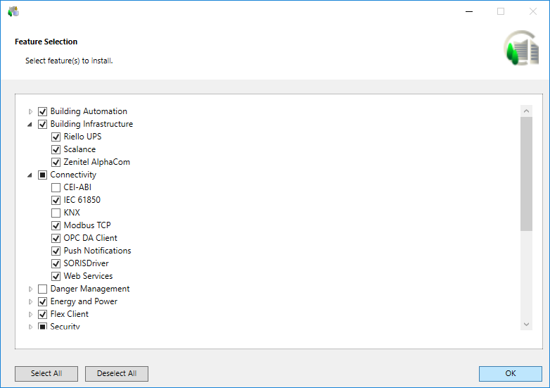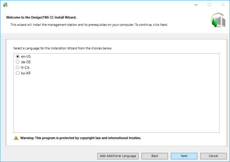 - Accept the default language selection. The installation language of the OS is the default language if the language pack is available; otherwise, en-US is used. The Welcome to the Desigo CC Install Wizard dialog box and all related messages on this dialog box, however, always display in en-US.