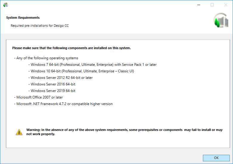 - If a mandatory prerequisite fails to install, a message displays and the Desigo CC Installer aborts the installation process. However, if a non-mandatory prerequisite fails to install, the installation process continues and notifies you about the failure at the end of the installation process.