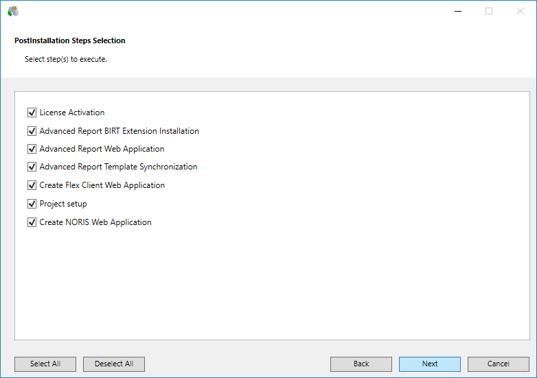 NOTE: Only those post-installation steps, for which the tag is configured as Execute = AskUser in the [GMS/EMName]PostInstallationConfig.txt file, are displayed in the PostInstallation Steps Selection dialog box.