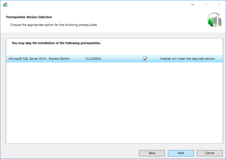 NOTE 2: When you install the Server on a fresh system, by default, the prerequisite Microsoft SQL Server 2014 - Express Edition is listed in the Prerequisites Version Selection dialog box.