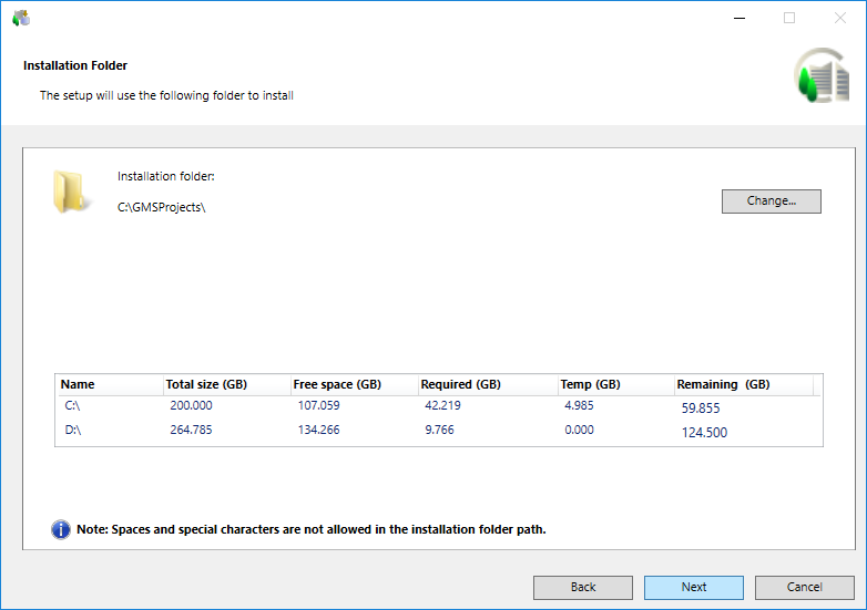 - In the Installation Folder dialog box, accept the default installation directory location C:\GMSProjects for the installation or choose a new location by clicking Change.