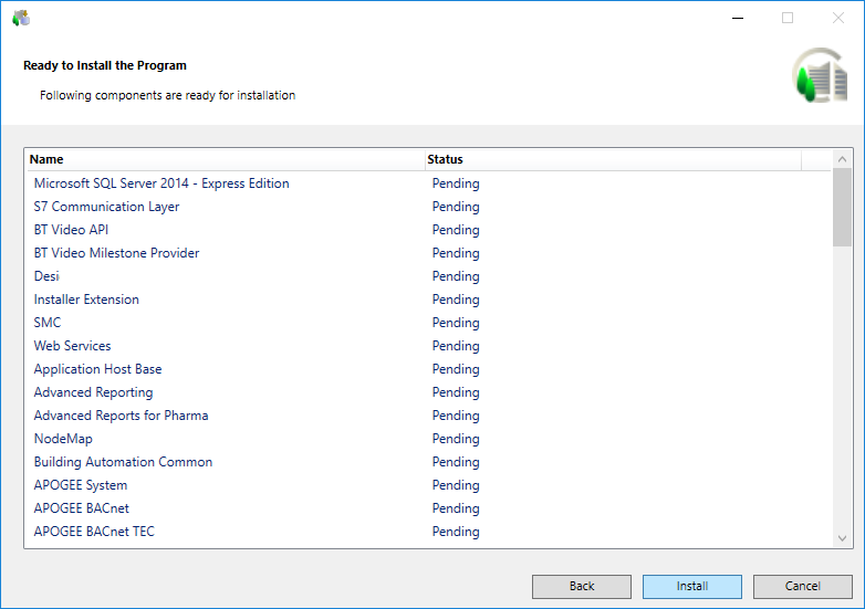 - Click Next to display the Ready to Install the Program dialog box listing the status of the prerequisites, Desigo CC installation, extension modules installation, help merging status, and the status of the post-installation steps that you selected for execution and status for those which are executed mandatorily.