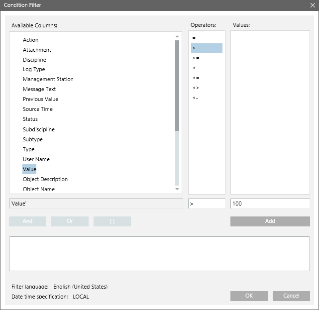 Scenario: You want to create an activities report to determine the number of times the Present Value property of an Analog Input object has exceeded 100 in the last 24 hours.