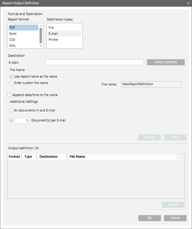 The Output Definition list in the Report Output Definition dialog box and Contacts selection list in the Email Contacts dialog box updates automatically,