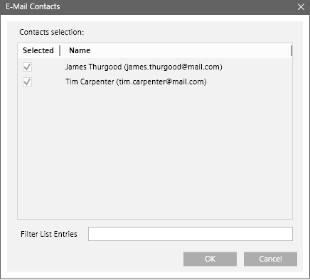 This dialog box allows you to choose and filter from the list of all recipients having email addresses configured in the Contacts selection list.