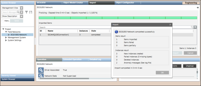 The new IEC61850 driver object displays in the System Browser below the Drivers node and is selected.