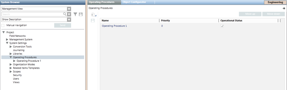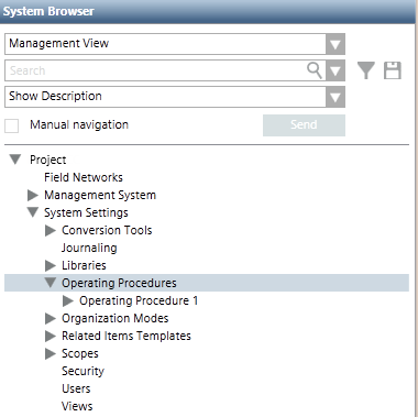 Operating procedures are located under System Settings > Operating Procedures in the Management View of System Browser. They may be further organized into subfolders under the main Operating Procedures folder.