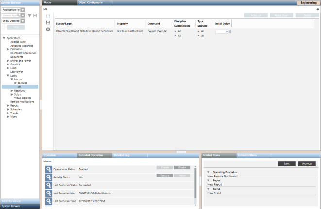 Drag-and-drop the report definition from System Browser into the Macro tab. This will cause a new row to be created.