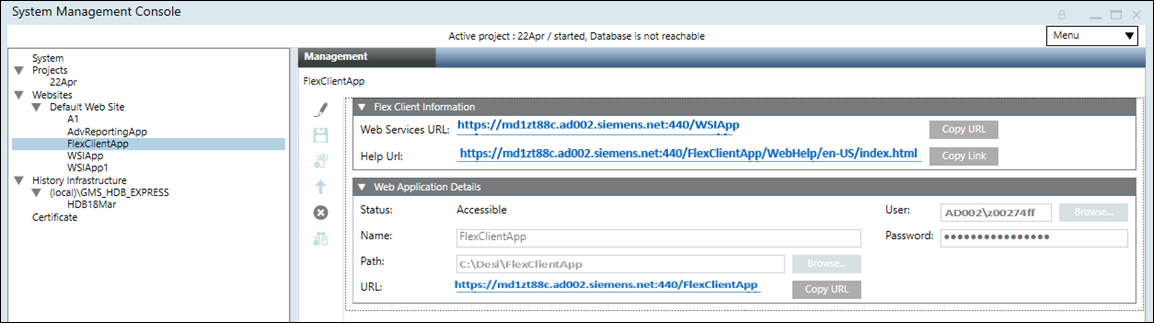 In the SMC tree, select Websites > [Website name]. a. Select the Management tab. b. Select the existing Web Services application. c. In the Web Application Details expander, click Copy URL.