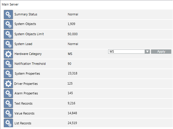 In Engineering mode, when you select the Main Server object in System Browser, information about the hardware category and system limits displays in the Extended Operation tab. The various properties and commands of the Main Server object, which also include those relating to the hardware category and system limits.