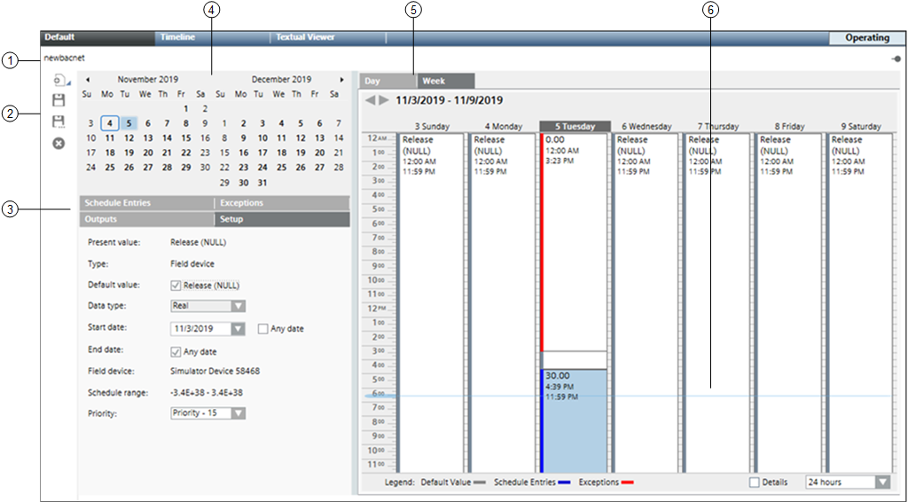 3 | Tabs | Displays four tabs: Schedule Entries, Outputs, Exceptions, and Setup. Schedule Entries: Displays a list of entries for the selected date. Outputs: Outputs are objects associated with the schedule. You can drag-and-drop objects to any tab to add them to the schedule. Dropping them on a tab other than the Outputs tab makes the Outputs tab active. Selecting an object in this section sends data about the object to the Operation and Extended Operation tabs, where you can view additional information about the object and make changes to it. Double-clicking an output makes it the new primary selection. Exceptions: Displays a list of exceptions for the selected date and allows you to set the precedence of the exception, the exception period, and detailed settings for day, month, year, and the recurrence pattern. For calendar exceptions, you can choose a calendar object from a drop-down list. Adding an exception makes the Exceptions tab active. You can create an exception by right-clicking the schedule or by clicking the New button in the Exceptions tab. Setup: Displays common schedule information such as the Present Value of an object, the type of object, the default value for the object, a Release (NULL) check box, and the data type of the schedule outputs for this schedule By default, the system automatically creates weekly schedule entries for the default state, which you can modify. The Release (NULL) check box allows you to bypass the established priority and return an object to its default value. For example, to return control to lower priority commands, check the Release (NULL) check box for the schedule default, and then create a schedule entry with the Default check box checked. This will write BACnet null to the priority slot for the schedule, returning control to the system. Within this tab, you can also select the command priority. The Present Value of some object types is based on a command priority and established in a hierarchy that ranks from highest (1 – Manual Life Safety) to lowest (16 - Available). The hierarchy determines which source has priority over another to change the value of an object. To command one of these object types, you—or an application—must have a command priority equal to or greater than the current command priority of the object. Typically, PPCL is set to priority 16, and schedules are set to priority 15. The schedule range displays a predetermined range for an object type. The first object dropped in the Schedule Output section for that type determines the range that is displayed. For example, for an analog output such as a room temperature set point, you might see a range of 69 – 75 degrees Fahrenheit |