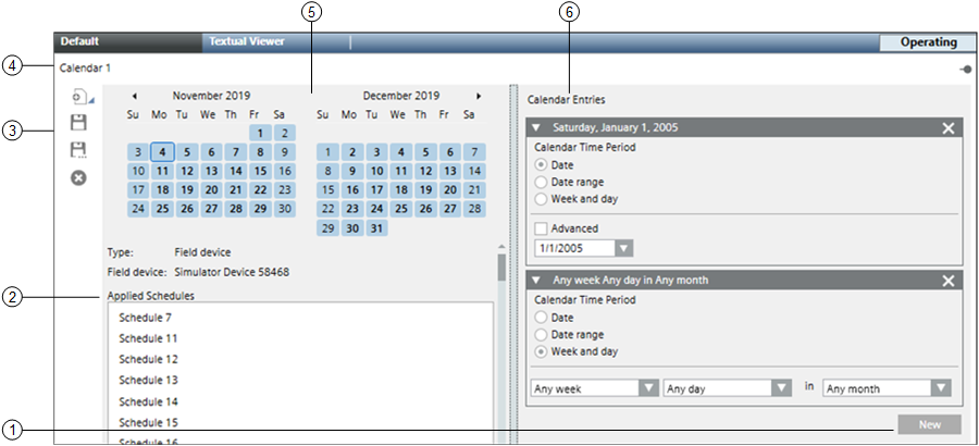 4 | Calendar | Allows you to select a day to view or create schedule entries. When first displayed or refreshed, the current day is selected by default. By default, every new schedule begins with the current date and never ends. Once a new schedule is opened, you can choose the start and end date for the schedule. |