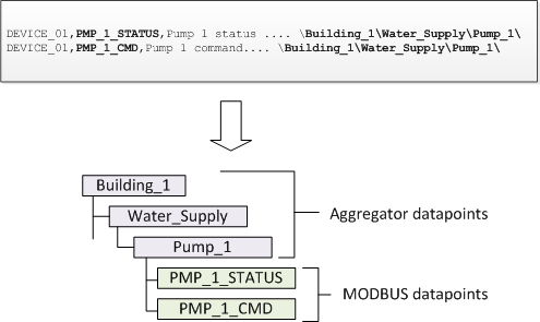 In the management station, data points can be viewed in various hierarchies. Hierarchies reflect the structural organization of data points. The three principal hierarchies used are Physical, Logical, and User. Physical hierarchy represents the data points as a part of the hardware device, and hence they appear as a flat list of data point objects under a device node. In addition to representing the physical containment of data points, it is often required to give a logical or technical structuring to the data points. For example, a digital input and a digital output data point may logically represent the status and command of a pump. In this case, it is possible to put the two data points as children of an aggregator data point representing the pump. This can be done by specifying the Logical hierarchy path. The path can have multiple elements separated by a specific delimiting character. Each element of the path is then translated into a hierarchy. The following figure illustrates this translation.