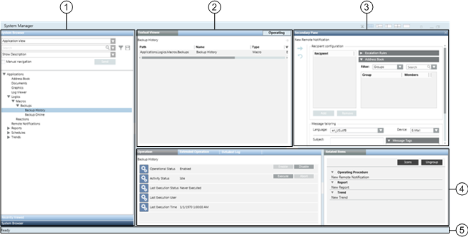 The system screen can display many windows, some of which are made up of multiple panes, divided by splitters. A window can contain up to four panes. Each pane houses a functional component of Desigo CC (such as a browser for navigating and selecting system objects, a viewer for displaying site floor plans or tools for inspecting the properties of objects).