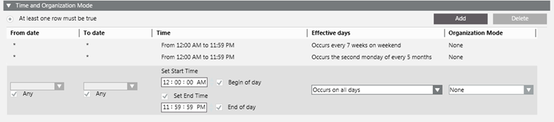 Each condition occupies one row and at least one row must be true (OR logic between rows) to assert the Time and Organization Mode trigger/filter: