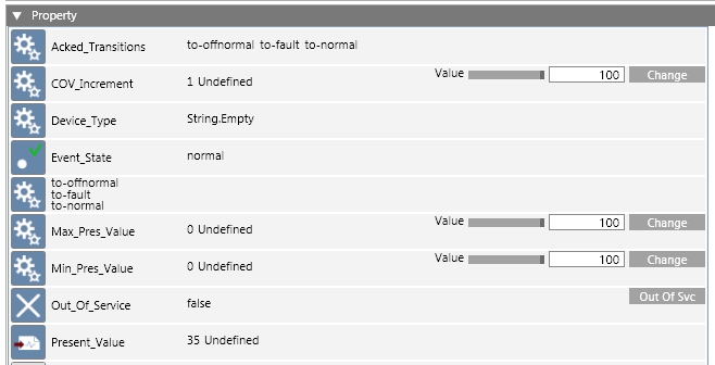 The Property section shows, by default, any additional BACnet properties not displayed in any other sections of this application. Properties that you can update have visible fields and buttons.