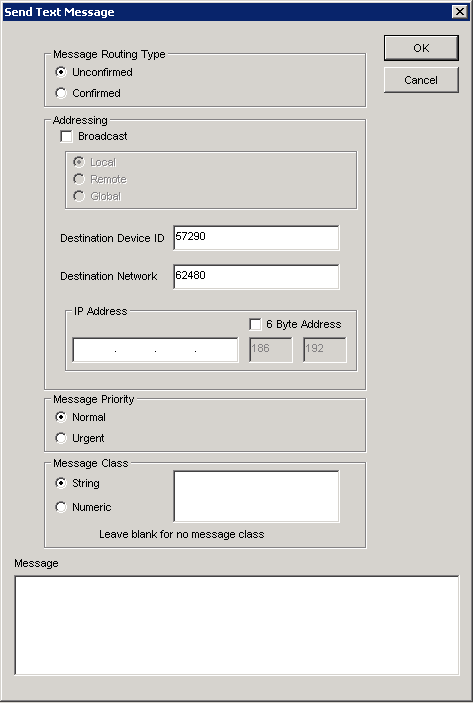 Click this check box to broadcast the text message to the local subnet, a remote subnet, or globally. |