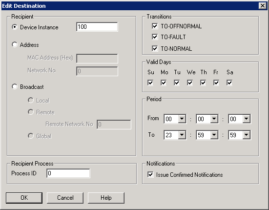 The Edit Destination dialog box allows you to edit an existing BACnet destination or add a new BACnet destination in the Recipient_List property of a Notification Class object.