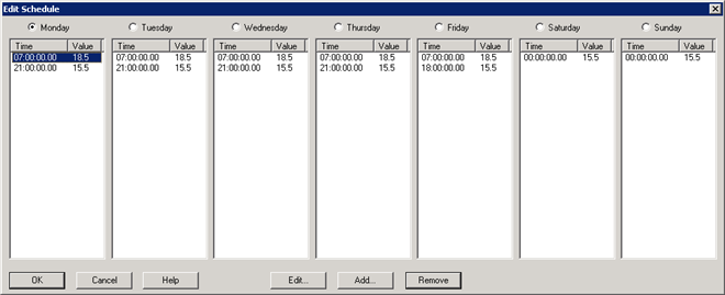 The Edit Schedule dialog box allows you to edit weekly schedules for the selected schedule object.