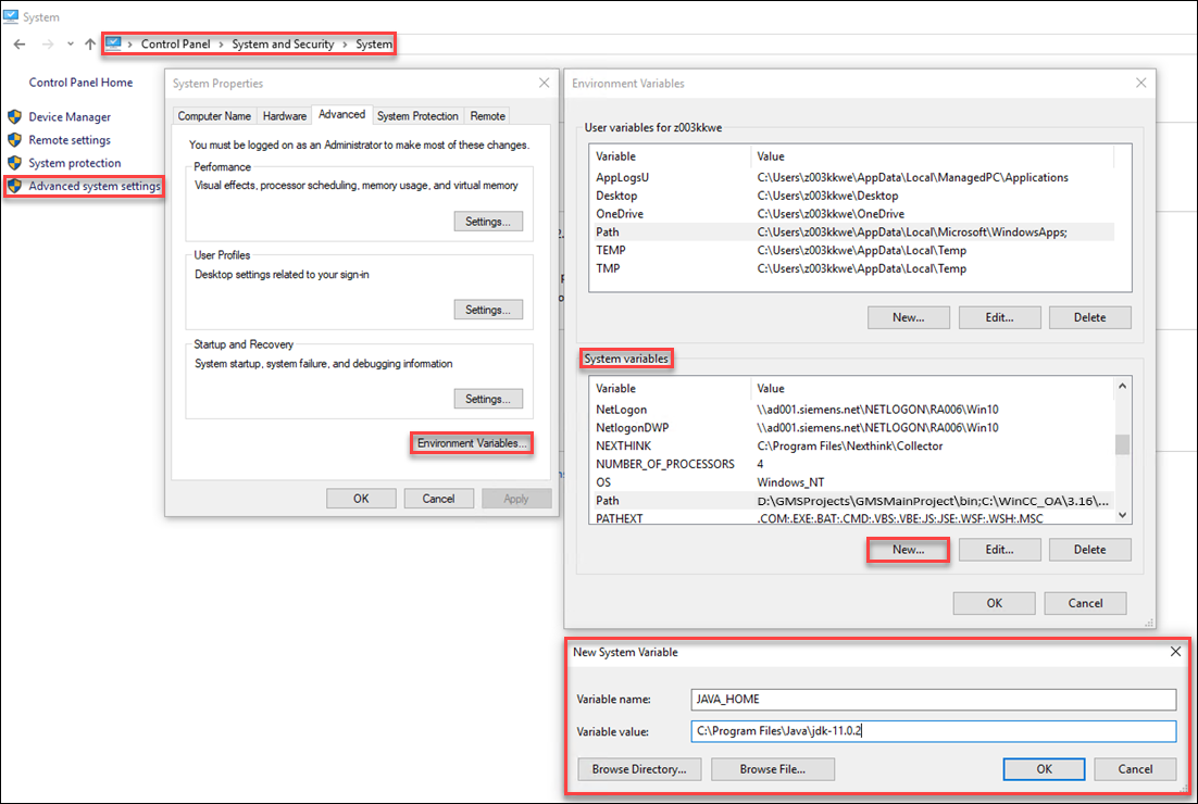 In the New System Variable dialog box that displays, specify the Variable name and Variable value. For example, Variable name: JAVA_HOME, Variable value: C:\Program Files\Java\jdk-11.0.2.
