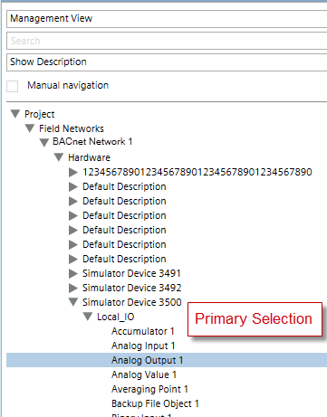 If you click a Symbol on a graphic or, the referenced object of the Symbol becomes the secondary selection, while the primary selection remains the same in System Browser. The following figure illustrates the primary selection in System Browser, Analog Output 1.