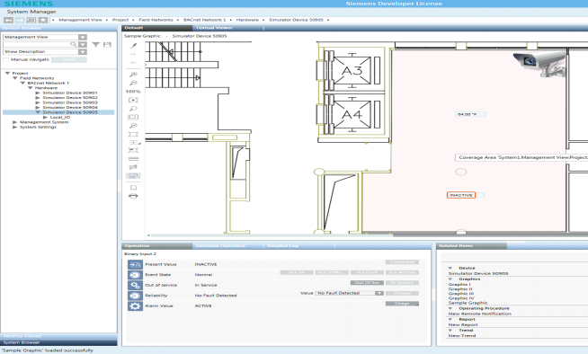 Desigo CC allows you to manually associate objects to one-another. For example, you can associate a fire detector (or any other object type) to a video camera or to a document. Then, whenever the fire detector is selected in the System Browser tree, the related video camera or document displays in the Related Items tab. The Coverage Area feature provides a graphical way to achieve the same result.