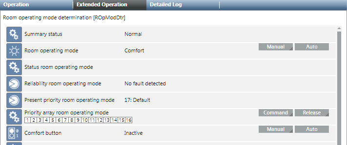 - The change to room operating mode occurs at priority 13 and can be overwritten locally.