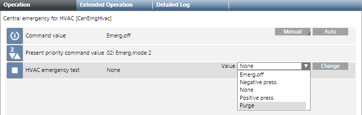Emergency functions are generally automatically switched via a binary contact from the fire detection system. You can switch using a fire service switch, or manually through a BACnet management platform. The procedure is described here.