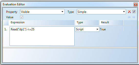 In this example, the objective is to hide the element on the graphic if the value of a given data point (dp1) is larger than the value of 25. The element property Visible receives the evaluation of the expression and depending on the value of the data point, the element is either visible on the graphic or not.