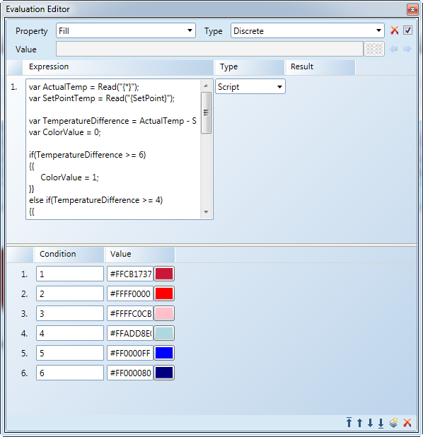 This is the most straightforward and simplest form of using script in an evaluation to represent a changing Fill color of an element. A Discrete type of evaluation with conditions is used. And, a script using two Read() methods is used. The script reads the actual temperature object reference and subtracts the value of the setpoint object reference. The value is examined by the evaluation, and depending on the value, the appropriate condition is chosen and the Fill color is changed.