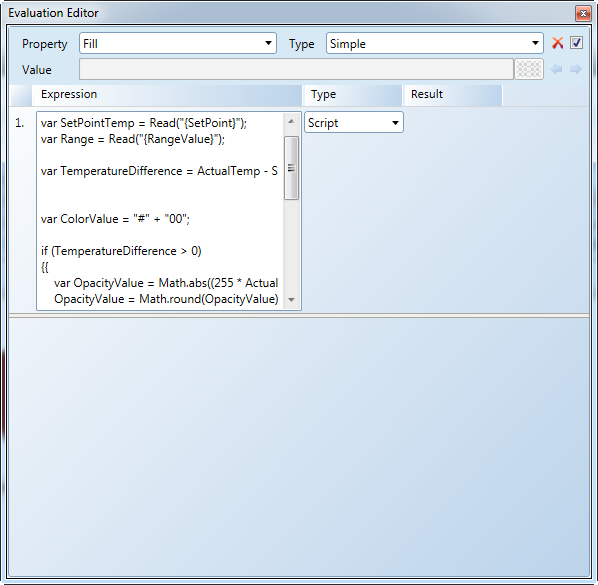 This example, is a more complicated use of Script for the original scenario. In this example, a Simple evaluation type is used. Therefore, unlike the Script Examples 1 and 2, this example does not use the Condition fields. Instead, the script is used to create the hexadecimal color value for the Fill color depending on the temperature difference of the room.