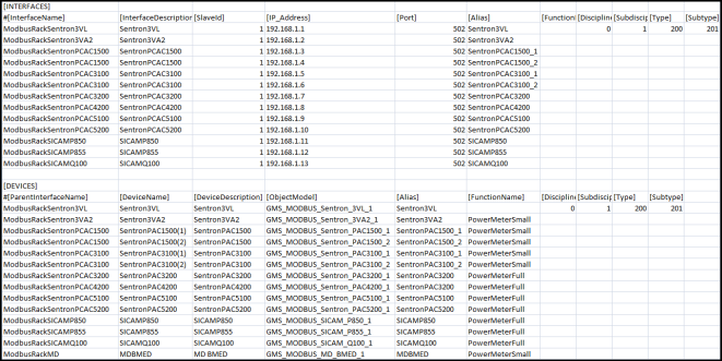 In order to create instances of the Modbus TCP Power Devices, you must create the engineering data in the form of a comma-separated value (CSV) file. A CSV file contains data in which values are represented as text and separated using a separator such as comma (,). This format can be easily edited in simple text editors such as Wordpad or Notepad. More elaborate editing can be done using advanced word processing tools, like Excel. The Importer can parse CSV files which only use the comma (,) as the separator.