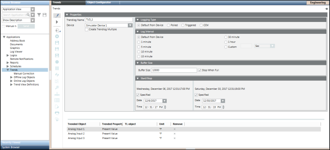 Therefore, in order to overcome this difficulty, there are options provided in the Edit Trend mode that enable you to create, modify, and delete the multiple BACnet trend log objects in a single click.