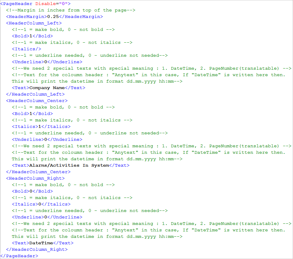 - (Optional) In <PageHeader>, specify Disable = “1” to disable the page header in the print out, and Disable = “0” to enable the Page Header in the print out. The default is Disable = “0”.