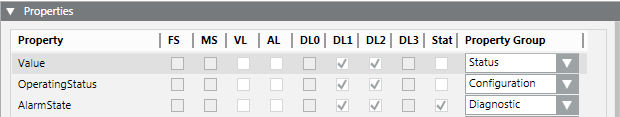- Define the properties for VL, AL, DL1, DL2, Status and Property Group.