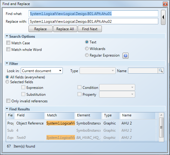 - Drag-and-drop the object from the existing plant to the Find what text field.