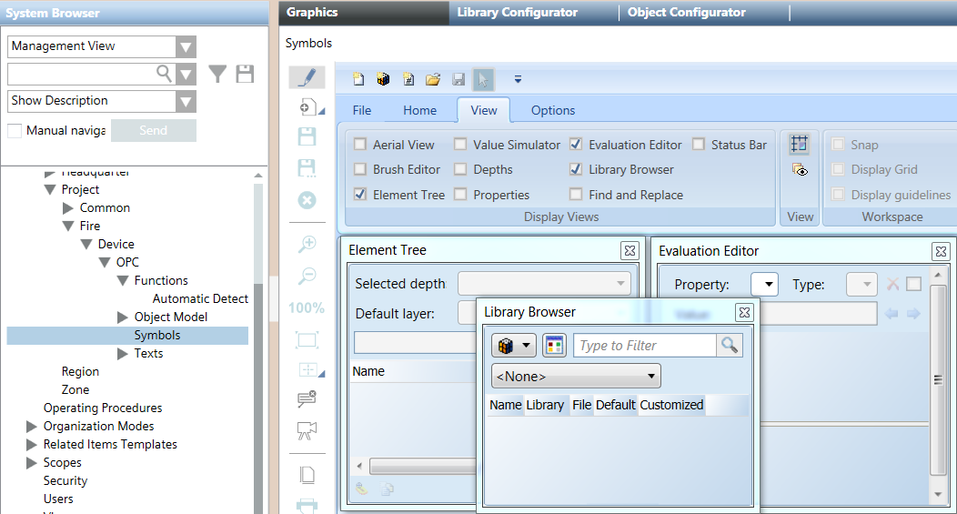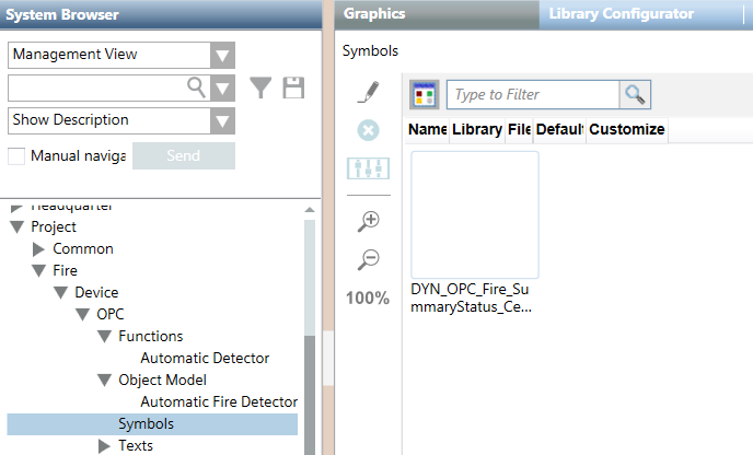 The name of the folder of the customized OPC library displays in the System Browser tree along with the folder description (for example, OPC [Fire_Device_OPC_Project_1]). c. Replace the first part of the reference with the name of the folder of the customized OPC library and the second part with the name of the renamed background image. For example, replace: Global_Base_HQ_1\DYN_All_Generic_SummaryStatus_Central_002 with: Fire_Device_OPC_Project_1\DYN_OPC_Fire_SummaryStatus_Central_002