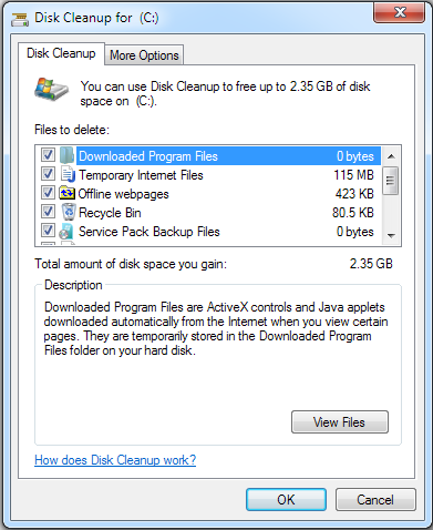 - In the Disk Cleanup: Drive Selection dialog box, for the selected hard disk, verify the file types that are selected by default before deleting them, and then click OK.