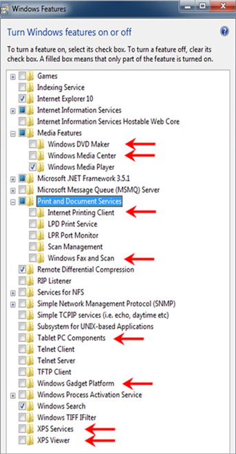 - Turn the Windows feature off by clearing the check box for the features as shown in the image below.