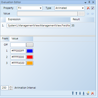 The Animated evaluation is used to change a property value by setting a value for each frame and then setting the interval times between frames and their associated values. In the Animated evaluation each value condition is considered a frame. One frame is used as the Off frame.