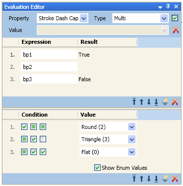 In this evaluation type, every condition has a check box that is associated with an expression created for the evaluation. If you have four expressions, each condition will display four check boxes. Each check box indicates if the expression is true, false, or unspecified (ignored) for the particular condition. The condition applied is then determined by how the associated check boxes are marked and the conditions are met. For each condition, the related expression check boxes from the top section of the Evaluation Editor are ordered from left (first expression) to right (last expression).