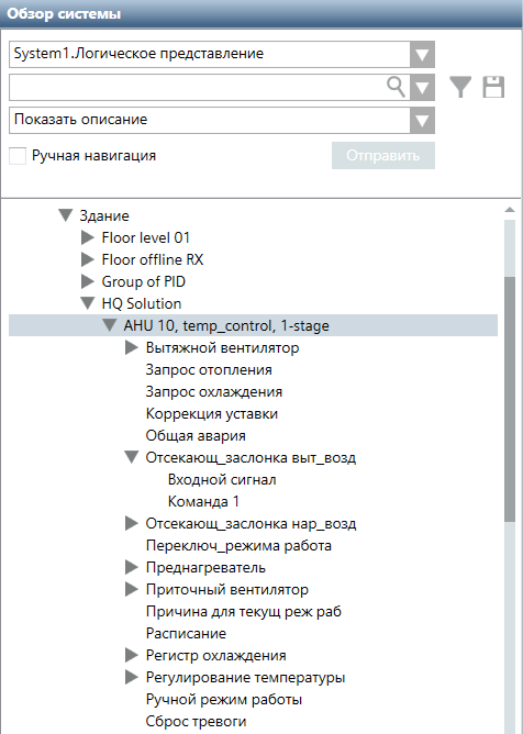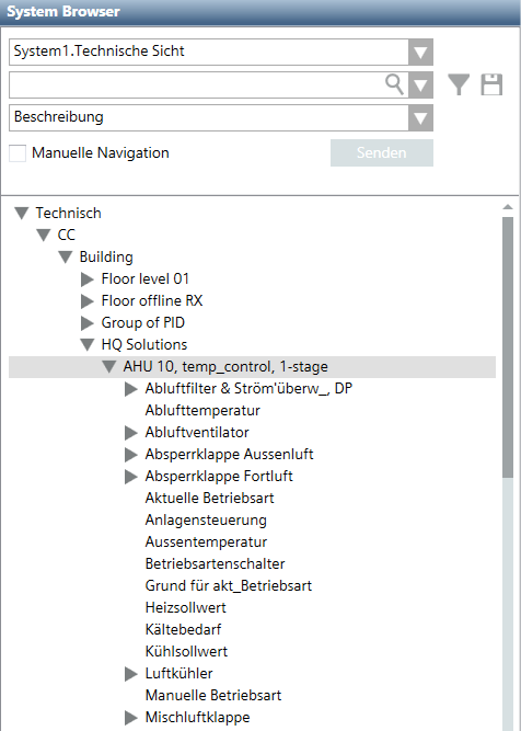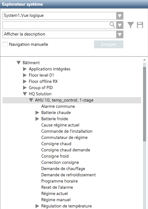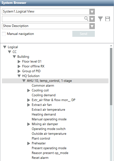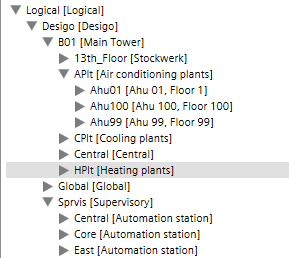 - Logical View: Displays BACnet data points, aggregators and subpoints that are in the database. The visual layout of these objects is based on the point naming convention (technical designation) of the object.