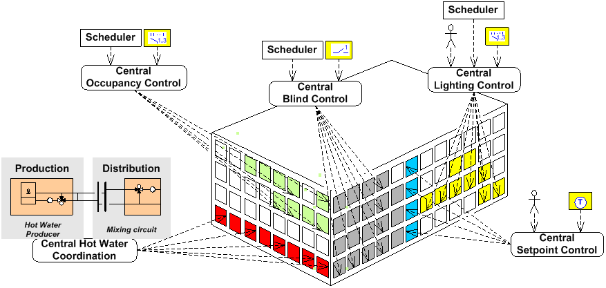 - Central hot water/chilled water coordination (Optimization of primary plants, supply chain optimization).