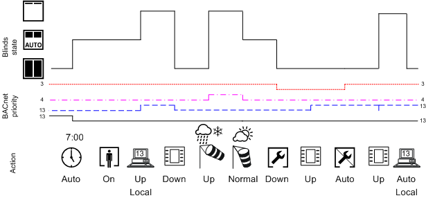 3 | Emergency mode 3 | For service and cleaning purposes, the blinds are commanded to a specific position, so that personnel can undertake the required work without the risk of blinds being lowered. |
