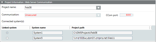 This expander allows you to select and link a project on Server to the web application. Depending on the Server project selected, the communication mode, the CCom port number, the system name, project path are automatically set. You cannot edit them here.