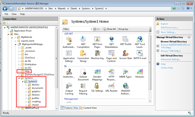 - The documents, graphics, libraries, profiles, and shared virtual directories are created under the Systems\[System Name] node in IIS on the target machine.